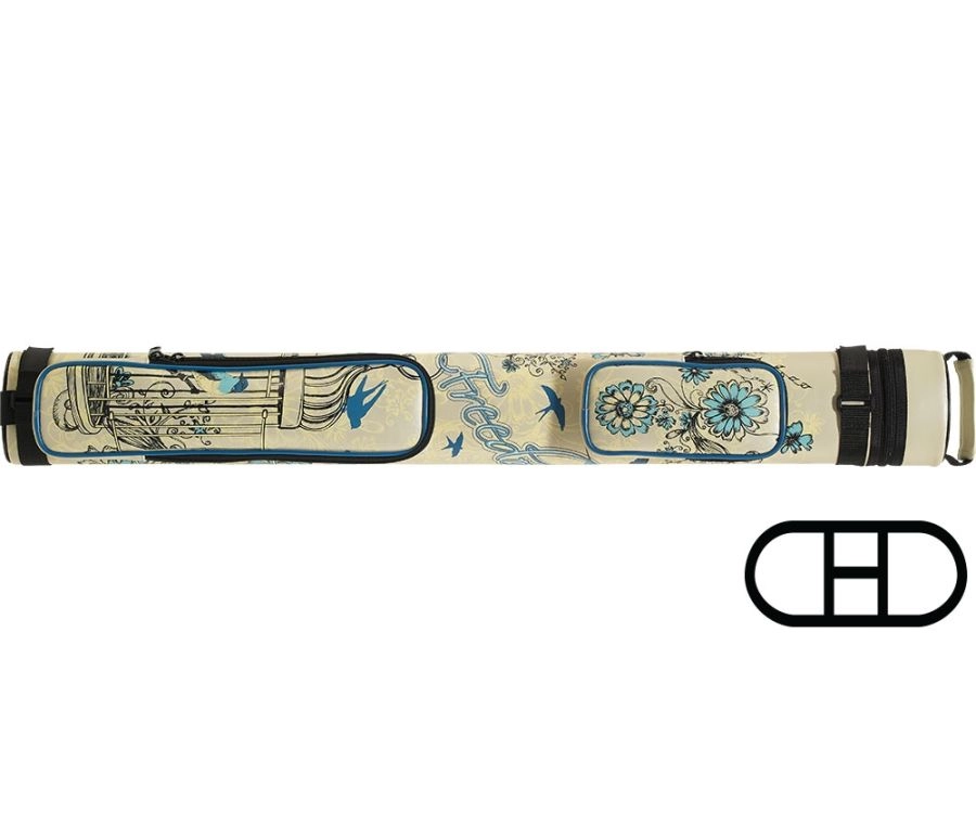 This Athena pool cue case is delicately designed with flowers and blue birds effortlessly flying about with “Freedom” embroidered between the two accessory pockets. The case holds 2 pools cues and comes with an upper handle and an adjustable shoulder strap.