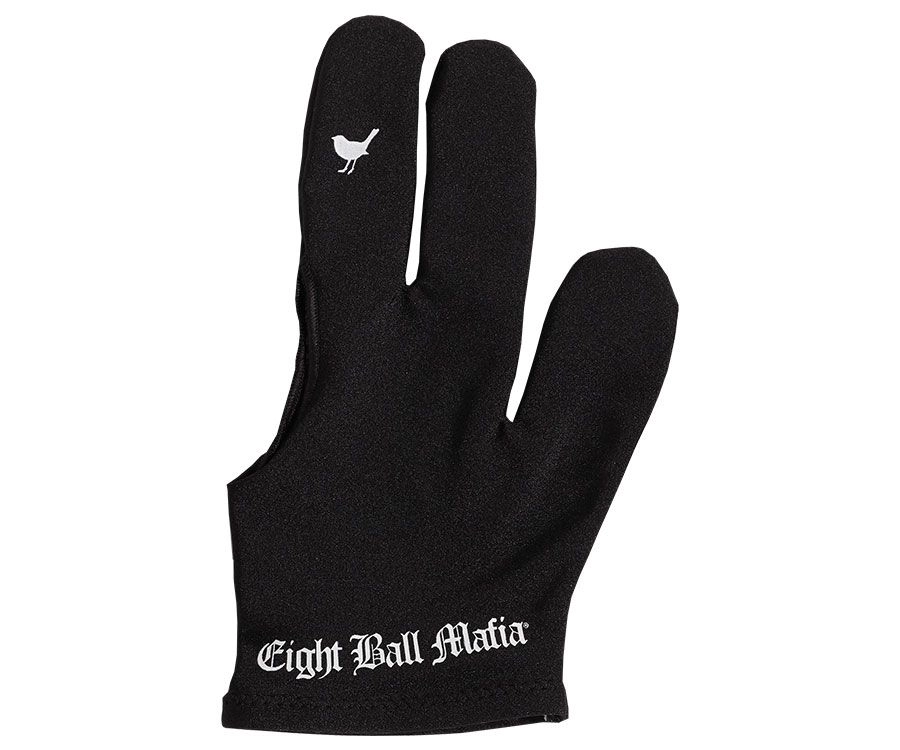 The Eight Ball Mafia black glove with “little birdy” design on the middle finger to tell opponents how you really feel. This glove is available for left bridge hand only.