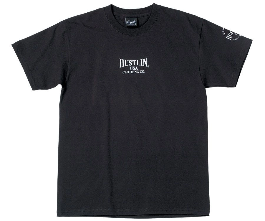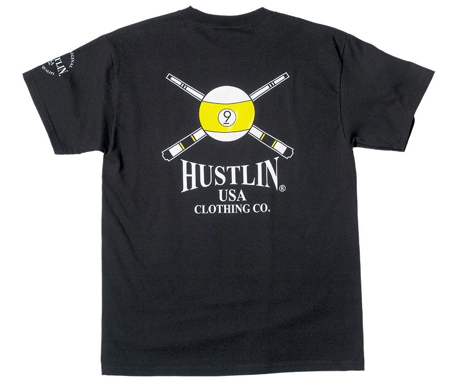 Rock out with your chalk out in this Hustlin USA 9-Ball Logo Tee. 100% Preshrunk Cotton. The slammin’ new 9-Ball design is on the back with Hustlin logos on the chest and sleeve.