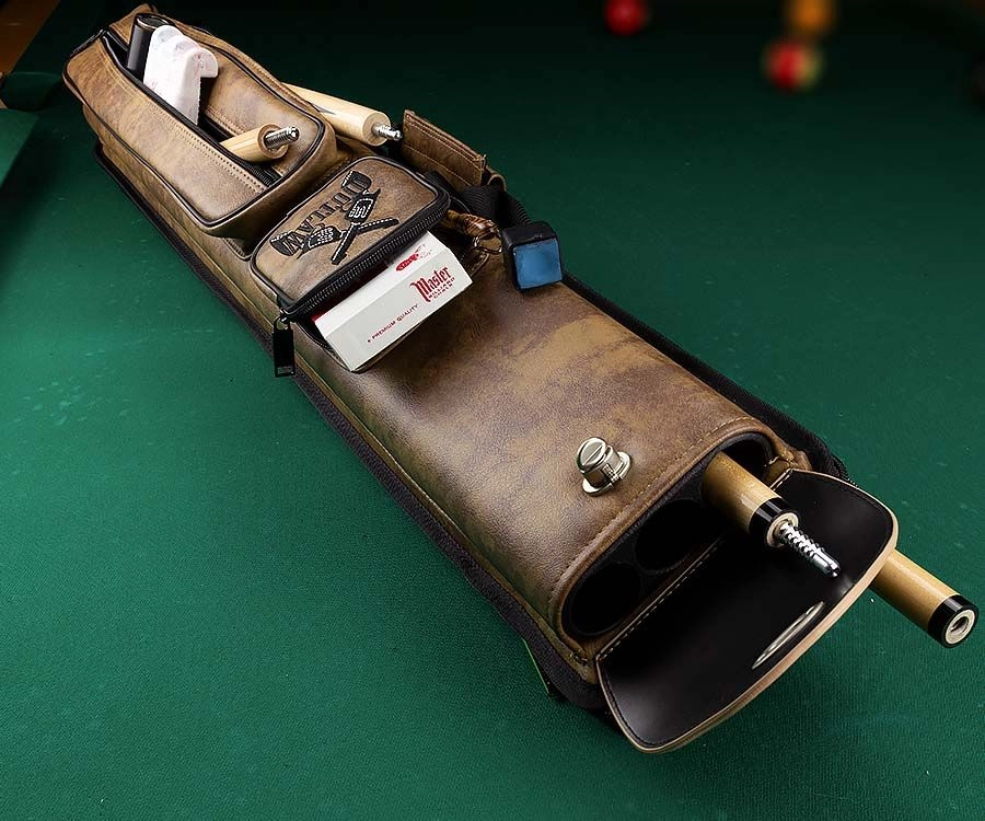 If you are at that point in your playing where you have a few cues and multiple shafts and want to take them all with you when you go shoot some pool, check out this case. This Outlaw Nexus 3 butt and 5 shaft hard case will carry all of your cues and shafts and has a nifty latch at the top instead of a zipper. The material on this case is ultra rugged as it is a Naugahyde type material which is what the heavy duty table covers are made of. And with spring loaded butt tubes, you can’t go wrong with this case.